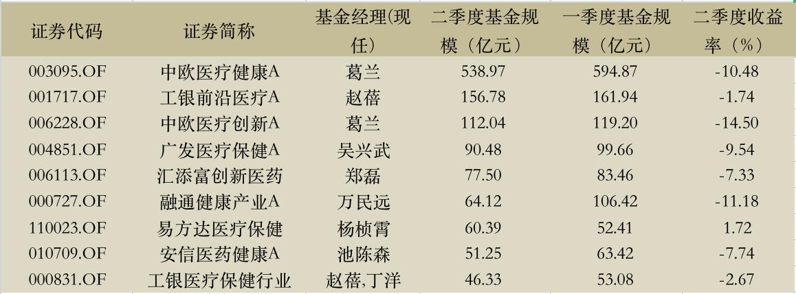 根据Wind数据,主动管理型医疗主题基金按规模排名,葛兰的中欧医疗健康A以538.97亿仍然位居第一,环比减少了60亿左右;有3只规模超百亿,但二季度规模都出现了不同程度的减少。