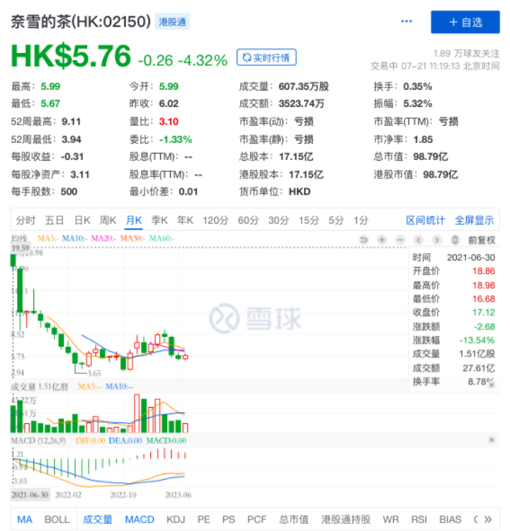 奈雪在2021年6月30日上市,当日股价报收17.12港元/股,达到历史最高点后,也终究成了历史。