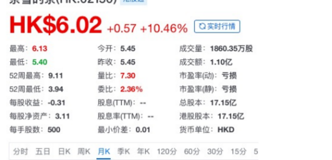 消息一出,奈雪股价应声上涨。当日股价报收6.02港元/股,涨10.46%,总市值为103.25亿港元。