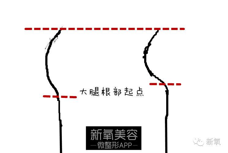 造成这种视觉效果的原因如下图,当我们的大腿和臀部的分界线不明显的时候,给人感觉,大腿根部的起点如左图,而当我们的分界线明显的时候,起点升高,自然腿的长度随之增加。
