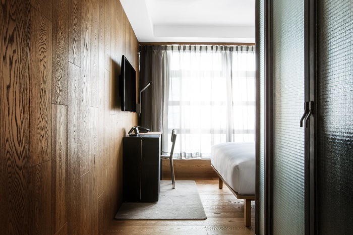 冰箱、浴袍、保险箱等藏在卫生间外的玻璃墙里,迷你吧也是“隐形”设计,拉开写字桌靠边的台面,水壶、咖啡茶饮、小食便以惊喜的方式出场。设计师像是在以幽默又微微带点挑逗性的方式和客人打招呼,对于探索欲强的客人来说整个居住体验又多几分趣味性。