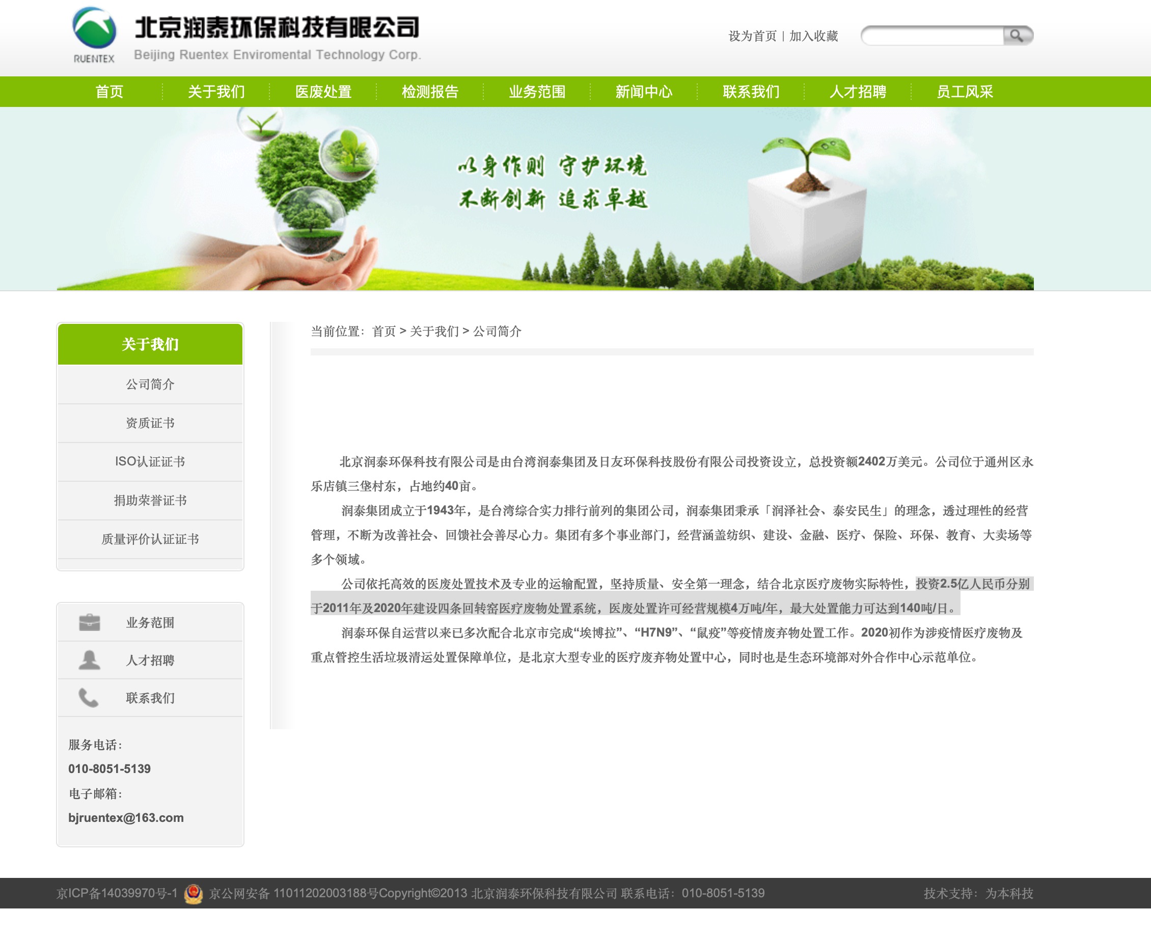 根据公司官网简介,北京润泰环保科技有限公司由台湾润泰集团及日友环保科技股份有限公司投资设立,主要负责北京医疗废物相关处置,参与了埃博拉、H7N9、鼠疫以及新冠肺炎等疫情废弃物的处置工作。