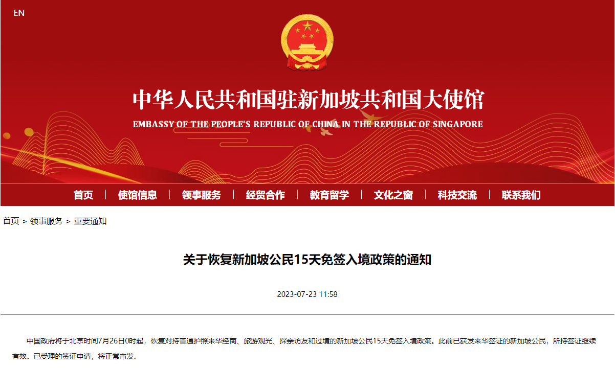 据中国驻新加坡大使馆,中国政府将于北京时间7月26日0时起,恢复对持普通护照来华经商、旅游观光、探亲访友和过境的新加坡公民15天免签入境政策。此前已获发来华签证的新加坡公民,所持签证继续有效。已受理的签证申请,将正常审发。