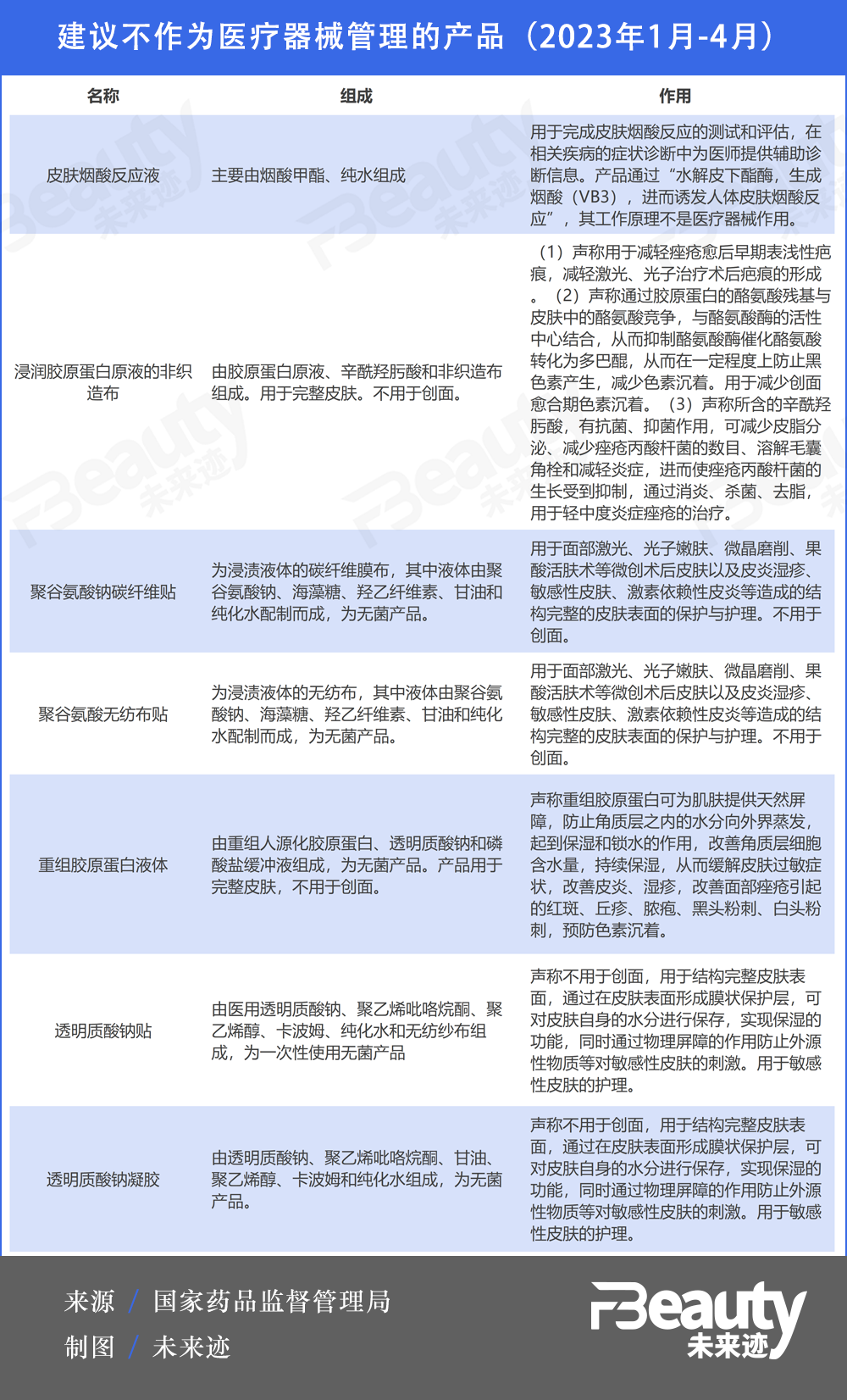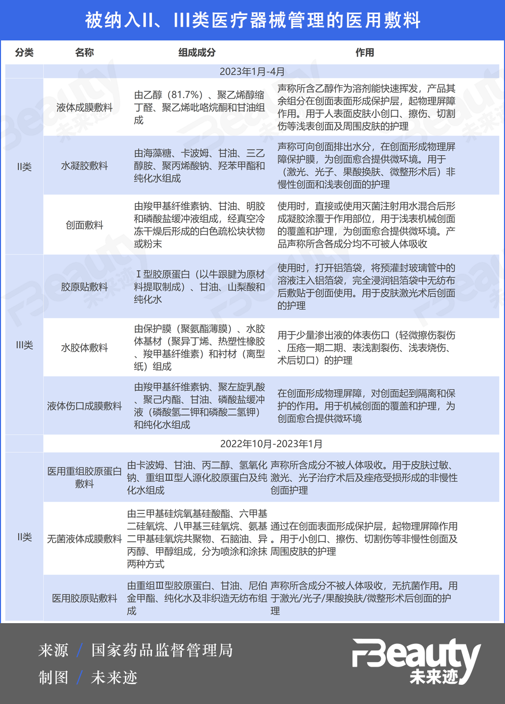 《结果汇总》中,有超20款医美器械产品的判定界限有所变动,加上不久前发布的《2023年第一次医疗器械分类界定结果汇总》,此次监管部的动刀的目标很清晰——械字号的医用敷料类产品。