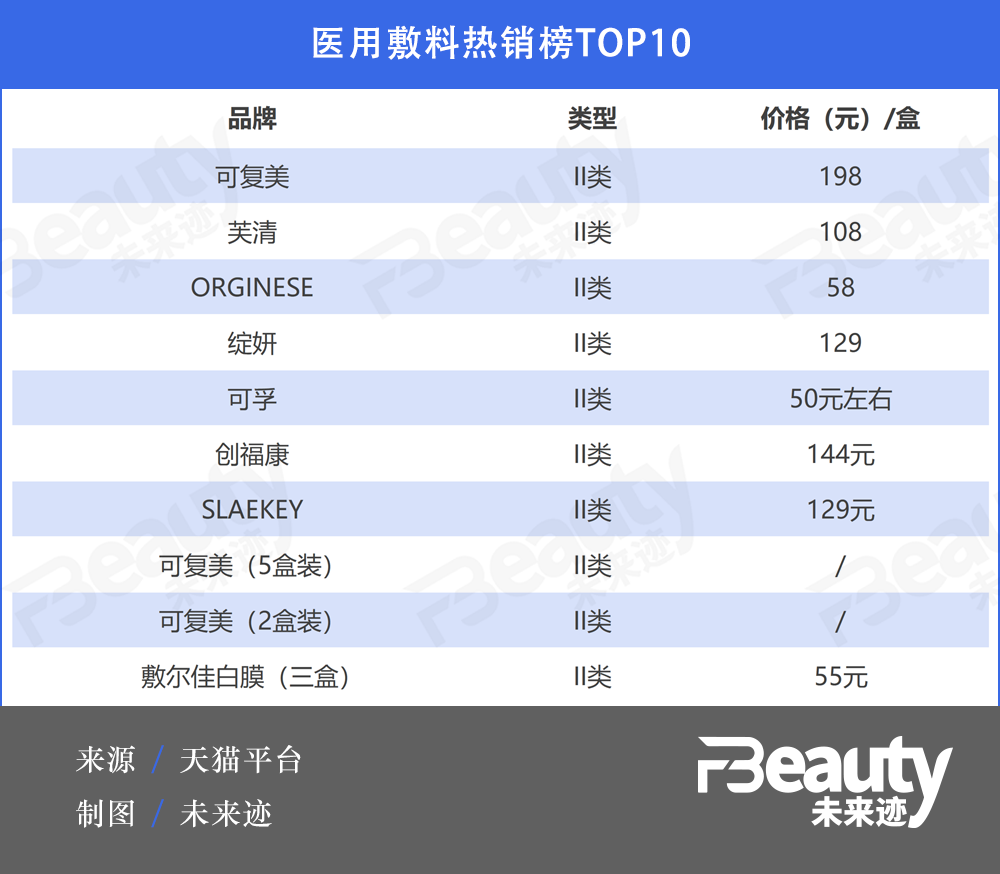 《FBeauty未来迹》观察发现,目前市面上的大多数医用敷料类产品均属于II类医疗器械,例如敷尔佳“白膜”“黑膜”、绽妍“蓝膜”等,III类医用敷料较少。