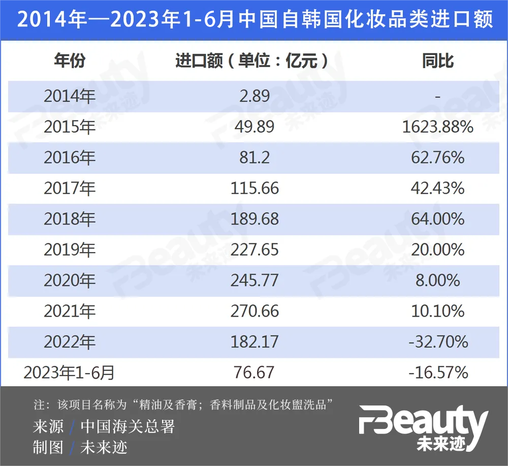 除开韩国“本土”,一直以来,中国都长期占据着韩妆几大集团海外市场第一的位置。根据中国海关总署发布的进口数据,中国自韩国的化妆品进口同比增速,在2015年竟高达1623.88%的峰值,此后增速有所放缓,2022年更是出现32.70%的负值,韩妆进口持续遇冷。