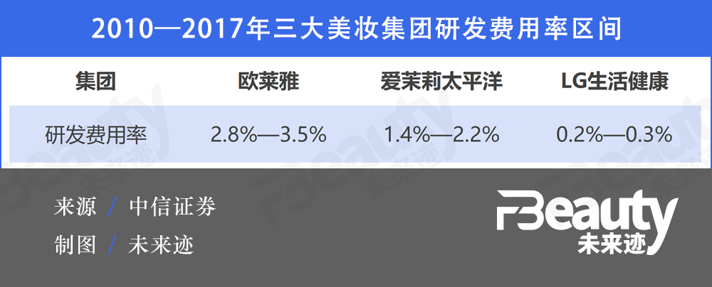 这其中,研发实力是高端消费市场的一个重要壁垒,长期以来,欧莱雅等巨头对于研发的大量投入,让他们拥有了雄厚的技术资本,根据中信证券数据,2010-2017年期间,欧莱雅集团的研发费用率达2.8%-3.5%,远高于爱茉莉太平洋和LG生活健康。