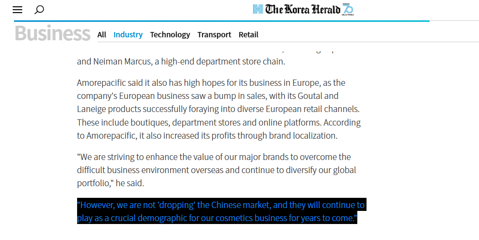 一位爱茉莉太平洋集团内部人士接受《韩国先驱报》的采访时也表示:“我们并没有‘放弃’中国市场,在未来几年里,他们将继续成为我们化妆品业务的关键客户群。”
