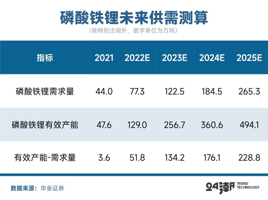 根据华金证券分析认为,2023年,磷酸铁锂有效产能将达256.7万吨,约是全球需求量的2.10倍。
