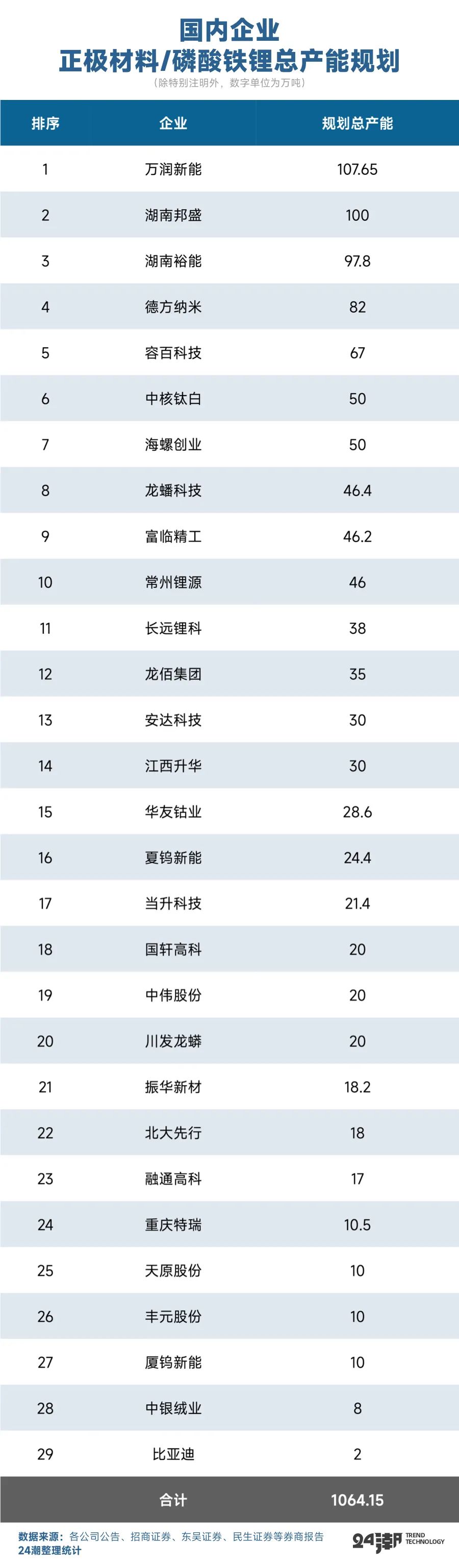 据24潮团队不完全统计,目前国内29家企业公布的正极材料/磷酸铁锂总产能规划已达1064.15万吨,海外企业产能规划近110万吨左右,海内外企业产能规划合计近1200万吨左右。这是上述券商对2025年最乐观需求预测的4.53倍。