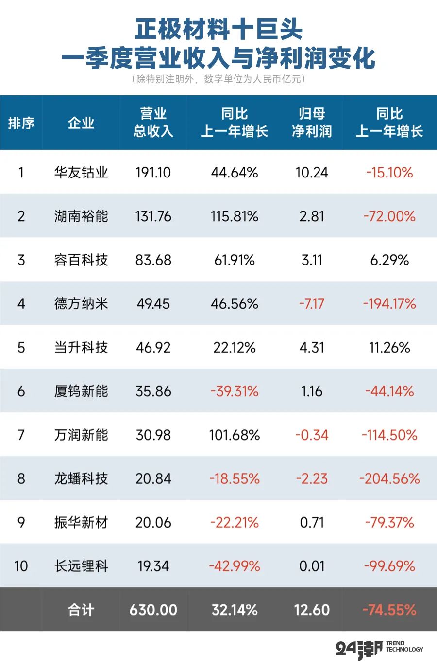 事实上,严峻的产业形势在一季度已经有所显现。据24潮团队统计,2023年一季度,十大正极材料巨头营业收入在保持32.14%增长趋势下,归母净利润却同比下降了74.55%。具体到企业层面,十巨头中只有当升科技和容百科技实现正增长,其他巨头净利润降幅均在两位数以上。