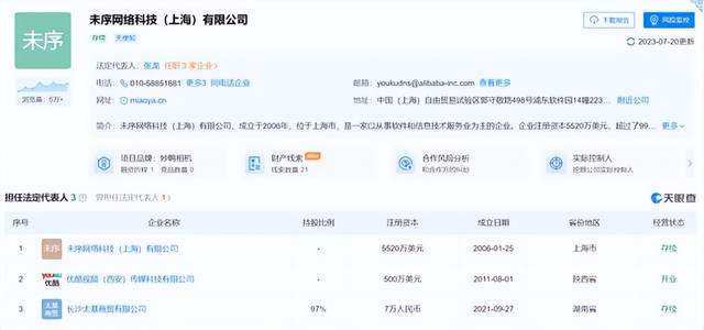 天眼查数据显示,妙鸭背后主体为未序网络科技(上海)有限公司,并于今年3月获得阿里大文娱一笔天使轮融资。与此同时,该公司的法定代表人张龙,还担任了优酷视频(西安)传媒科技有限公司的法人,同时还是该公司的执行董事兼总经理。