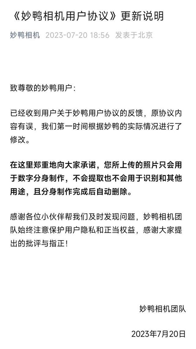 面对关于协议的质疑,7月20日,妙鸭相机在微信公众号、微博、小红书等多个平台发布了道歉声明,并表示已经对原协议有误内容进行了修改。