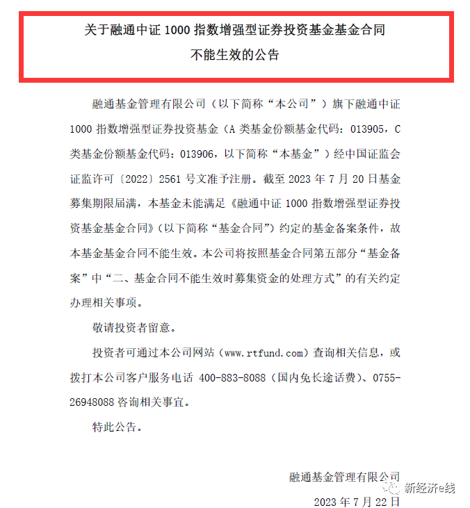 2023年7月22日,融通基金发布关于融通中证1000指数增强型证券投资基金基金合同不能生效的公告称,公司旗下融通中证1000指数增强型证券投资基金(A类基金份额基金代码:013905,C类基金份额基金代码:013906,以下简称“本基金”)经中国证监会证监许可〔2022〕2561号文准予注册。截至2023年7月20日基金募集期限届满,本基金未能满足基金合同约定的基金备案条件,故本基金基金合同不能生效。