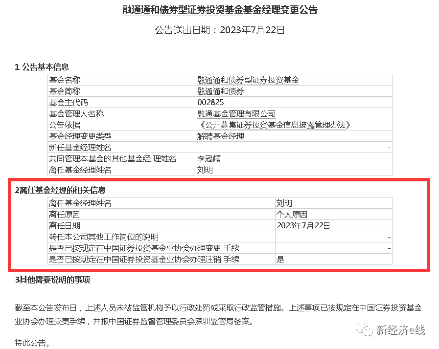 就在今年6月,融通基金原固定收益部总经理赵小强宣告离任,卸任了其管理的全部8只基金的基金经理职务,分别包括融通通源短融(A/C)、融通通祺(A/C)、融通增辉定期开放、融通增悦、融通通玺、融通通福(A/C)、融通通灿、融通中证中诚信央企信用债(A/C)。据融通基金6月6日发布的基金经理变更公告称,赵小强也因个人原因离任以上8只基金的基金经理职务,离任日期为2023年6月6日。