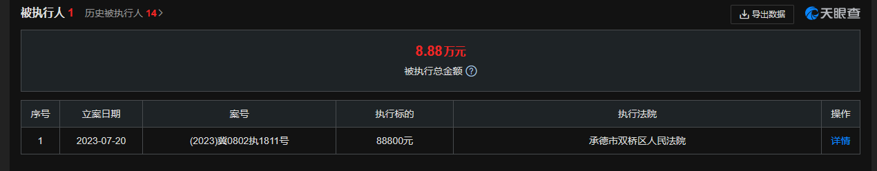 7月24日,天眼查显示,近日,承德智兴信泽商贸有限公司、比亚迪汽车有限公司新增被执行人信息,执行标的8.8万元,执行法院为河北省承德市双桥区人民法院。信息显示,比亚迪汽车有限公司成立于1997年,注册资本43.8亿元,由比亚迪股份有限公司、陕西省华秦投资集团有限公司分别持股99%、1%。