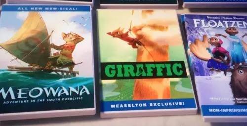 还记得那个卖盗版DVD店吗?《海洋奇缘 Moana》也在里面,最左边那个。《喵阿娜Meoana》,主角变成了一只猫。