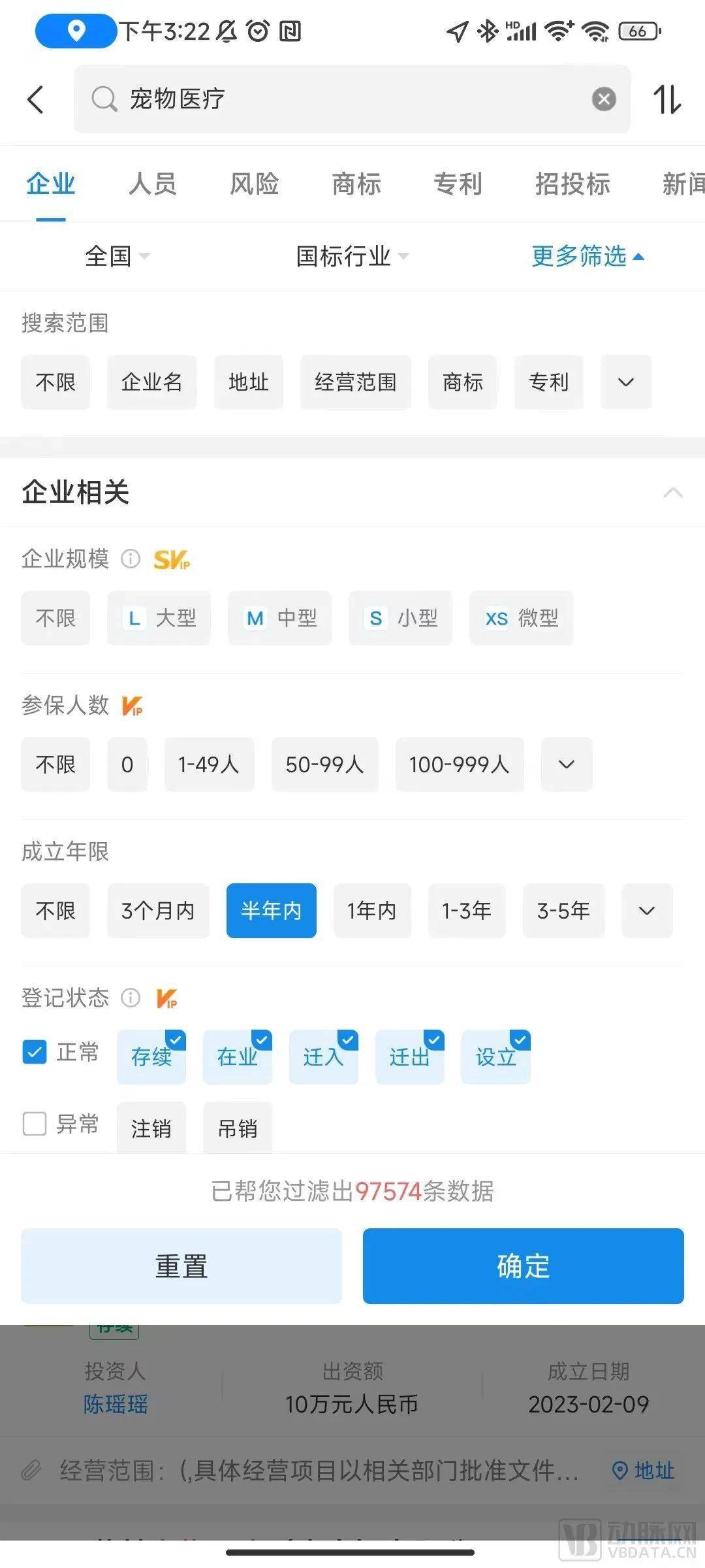 以“宠物医疗”为关键字在企查查中搜索,处于正常经营状态的大约有36.1万家企业,其中成立时间在1年内的约有15万家、成立时间在半年内的约有9.75万家,增长态势明显。