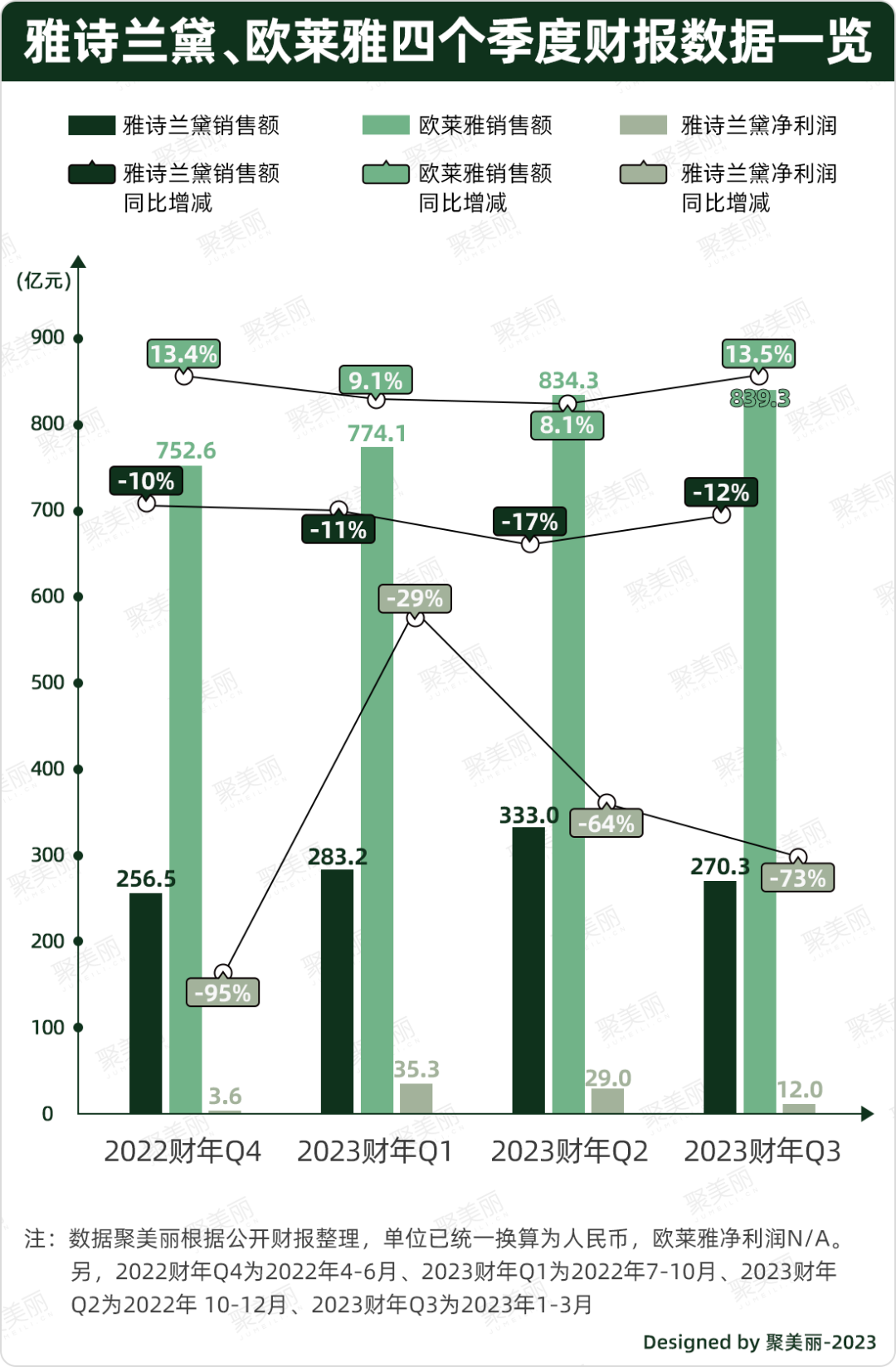 这已是雅诗兰黛从2022财年Q4开始,连续第四个季度营收、净利润双双下滑。