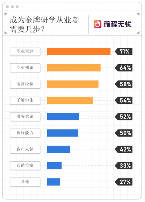 当被问及“距离你成为优秀的‘研学人’还需要哪些方面的提升”时,职业素养(71.2%)、专业知识(63.5%)、运营经验(57.7%)、对学生的了解(53.8%)、服务意识(52%)、执行能力(50%)、客户人脉(42.3%)、营销策略(32.7%)是受访从业者投票最多的选项。