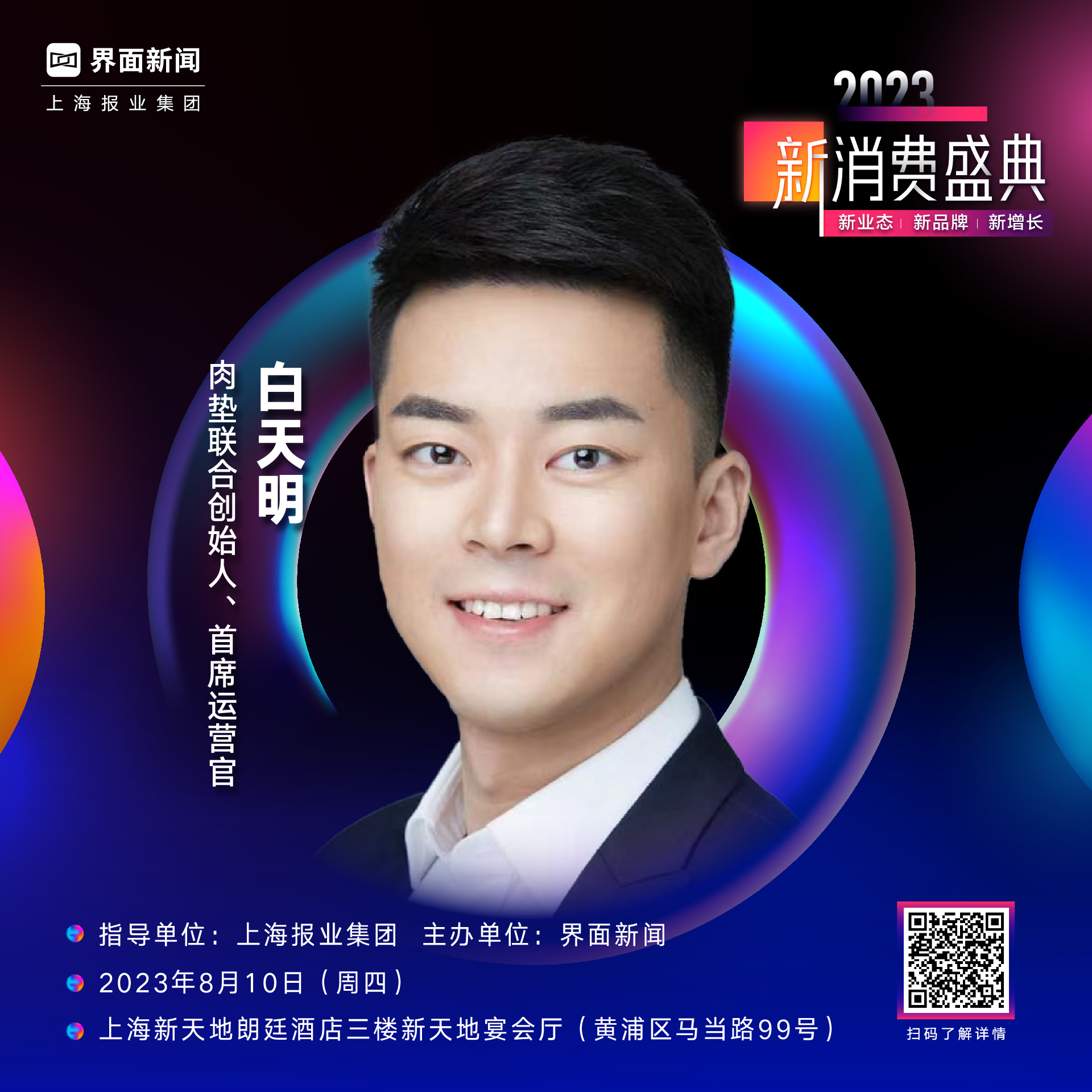 由上海报业集团指导、界面新闻主办的第六届【新消费盛典】将于8月10日于上海新天地朗廷酒店举行。肉垫联合创始人、首席运营官白天明确认出席第六届新消费盛典。