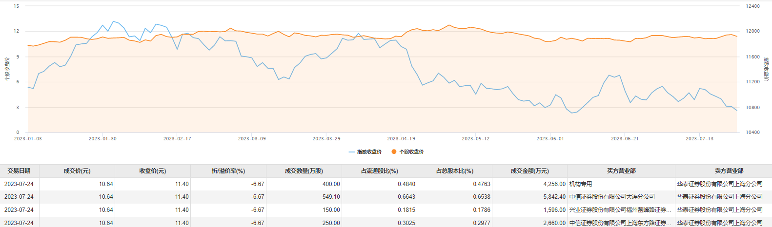 罗莱生活7月24日大宗交易成交1349.1万股,成交额1.44亿元,占当日总成交额的86.06%,成交价10.64元,较市场收盘价11.4元折价6.67%。