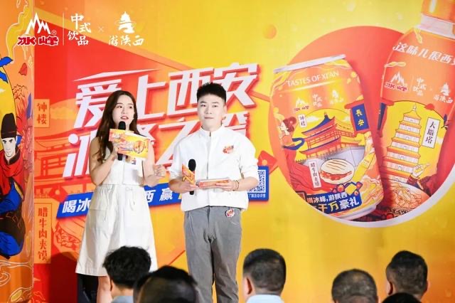 发布会以唐风乐舞的多样化节目作为开场。此次文旅罐体系列产品在包装上做了创新,西安冰峰以年轻人喜欢的插画作为创作形式,选取西安代表性的四个景点:钟楼、城墙、大雁塔、兵马俑,以及四款代表性美食:凉皮、腊牛肉夹馍、牛羊肉泡馍、裤带面为元素,把这些元素描绘于瓶身之上。鲜明亮丽的标签配色,真正与年轻消费者“颜值即正义”产生了认知共鸣。冰峰将与消费者携手西安美食美景,唱响全国。