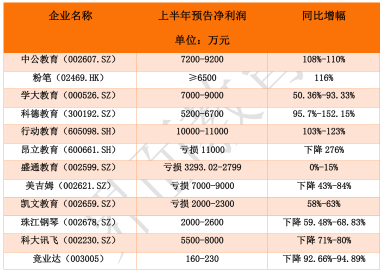 位于企业管理培训赛道的行动教育(605098.SH)也取得相对亮眼的业绩。预计上半年营收2.8亿-3亿元,同比增加39%-49%。净利润预计为1亿-1.1亿元,同比增加103%-123%。