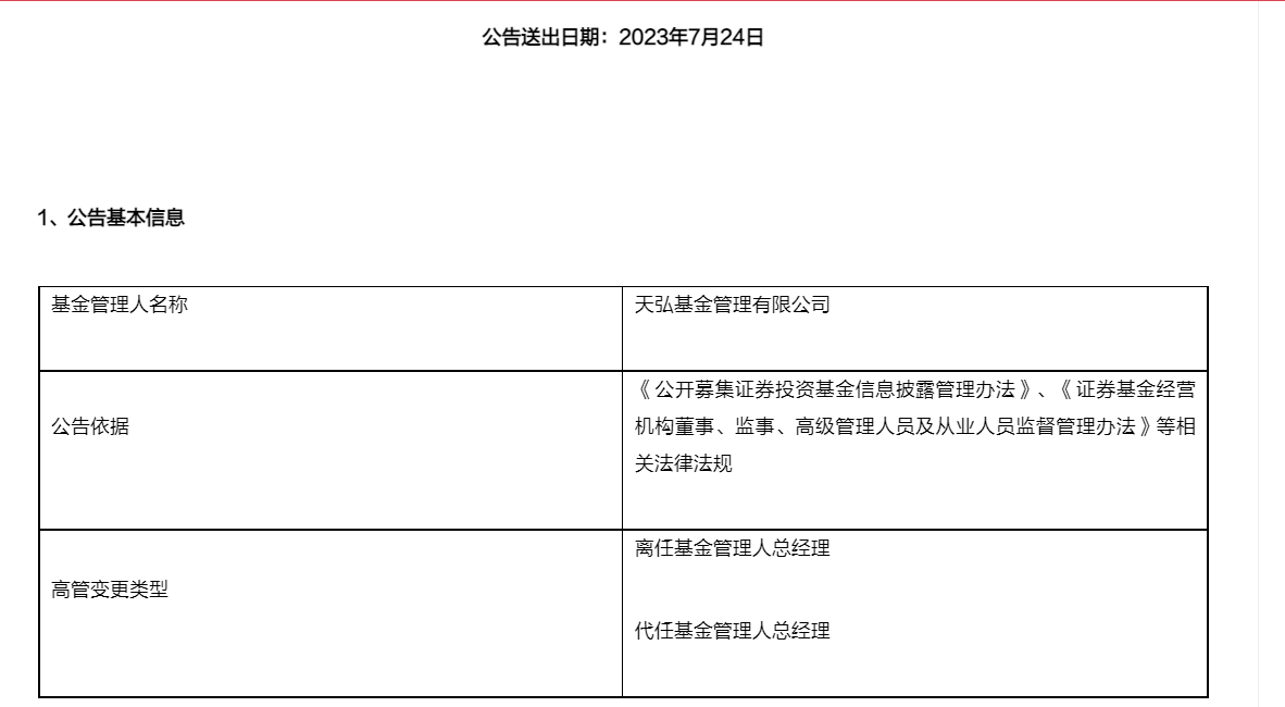 7月24日,天弘基金发布高级管理人员变更公告。公告显示,天弘基金总经理郭树强因个人原因离任,公司董事长韩歆毅将代任总经理职务,代任时间不超过六个月。