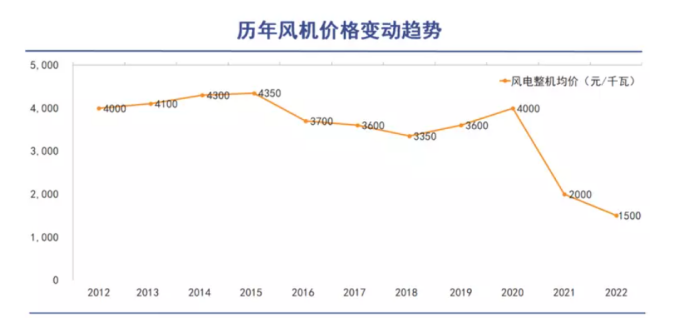 具体来看,本轮风电价格竞争自2020年的陆上风电抢装潮后开始,风电整机价格就出现了“报复性”下跌。2020年12月,业内出现了约2600元/千瓦的价格 (不含塔筒) ,较抢装时期4000元/千瓦的售价下跌了35%,