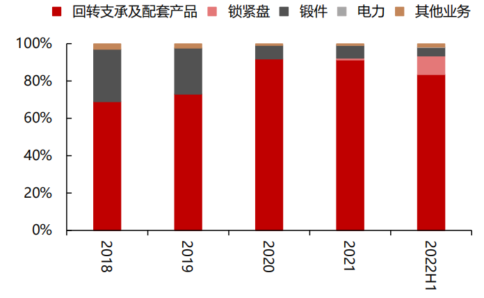 公司的产品主要应用于风力发电机组、海工装备、盾构机和工程机械等领域。产品包括了风电主轴轴承、偏航轴承、变桨轴承,海工装备起重机回转支承、盾构机轴承及关键零部件,以及锁紧盘和锻件等,但从营业收入来看,主要来源于回转支承及配套产品,也就是下游风电类产品的配套零部件。