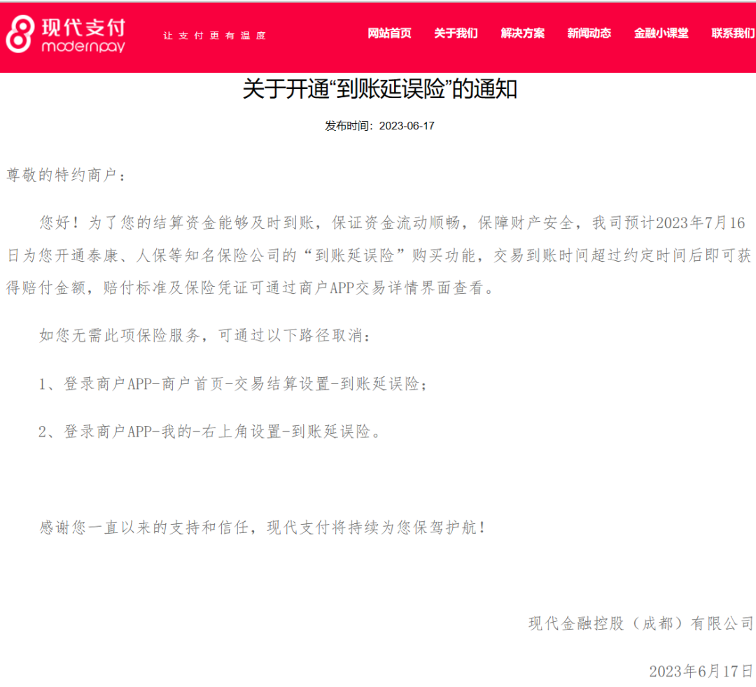 值得注意的是,现代金控在通知中提供了两种取消到账延误险的方式,即在商家APP内进行操作,但并未提及账延误险是“笔笔自动开通”还是需要商户“主动开通”。