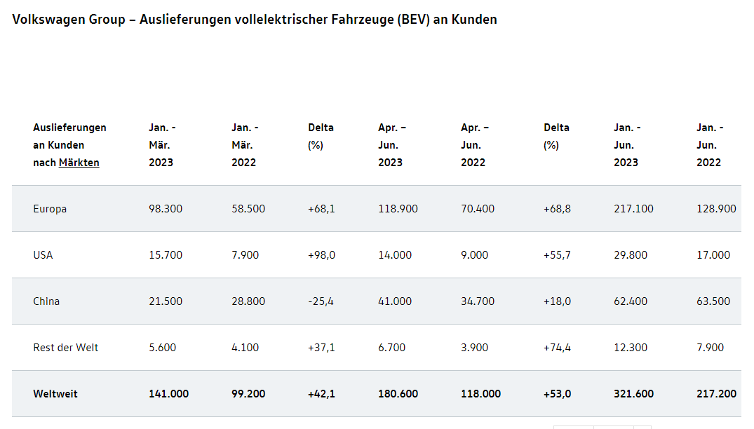 “在竞争激烈的市场环境中,中国纯电动汽车的交付量比前一年的水平低了约2%。”大众汽车解释称:“然而,最近这里(中国市场)的趋势也是积极的。继第一季度下降后,第二季度交付给全球最大汽车市场客户的纯电动汽车比上年同期增加了18%。”