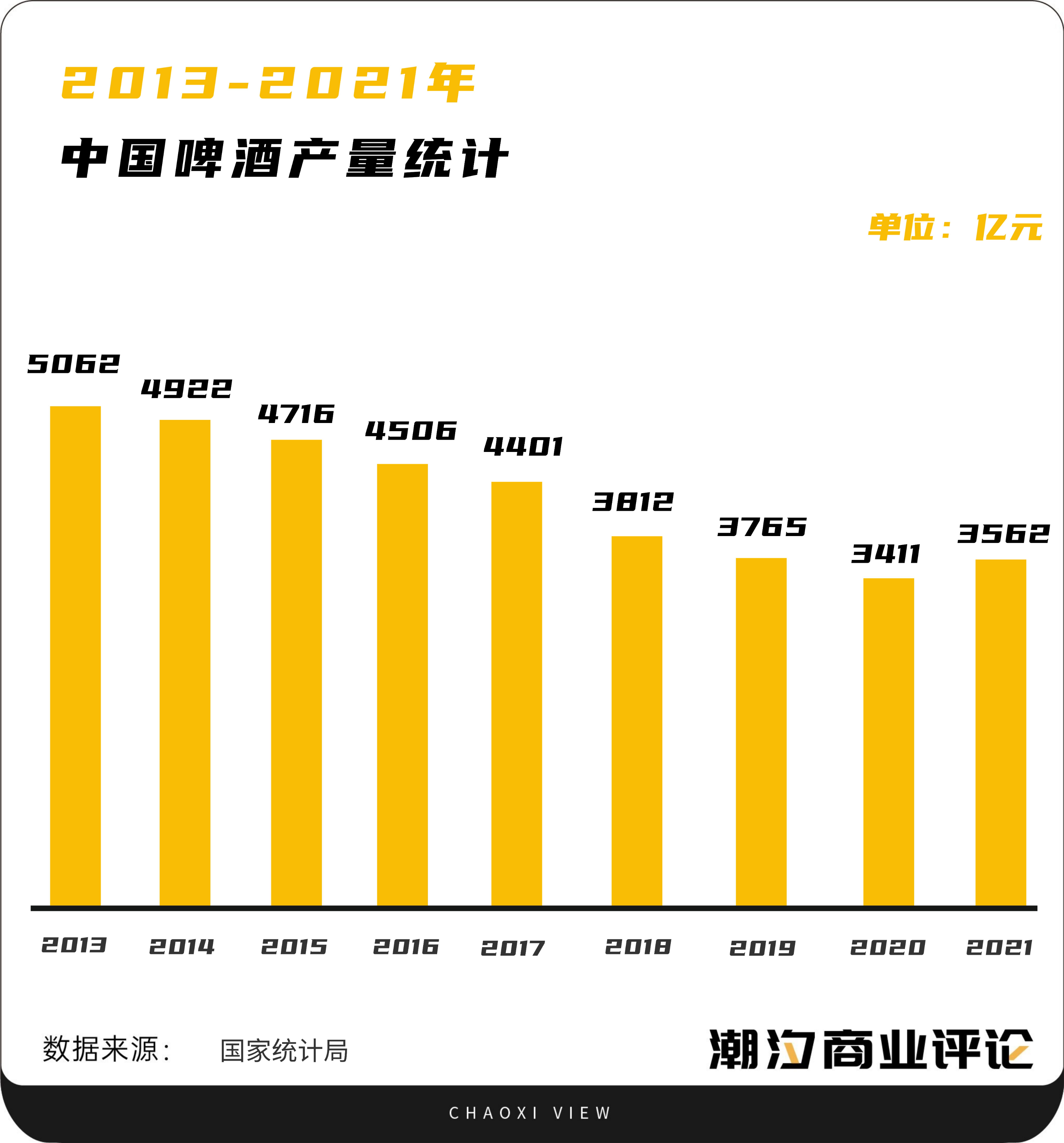 我国经济经过近些年的飞速发展,人均可支配收入也不断增加。投射在啤酒市场,在经数十年发展,中国啤酒行业的品牌集中度越来越高,啤酒市场也已经进入了成熟期。 根据国家统计局数据,2013年我国啤酒产量约为5062万千升,达到历年啤酒产量的最高点,此后,我国啤酒生产量开始连续下滑,到2020年啤酒产量已降至约为3411万千升。