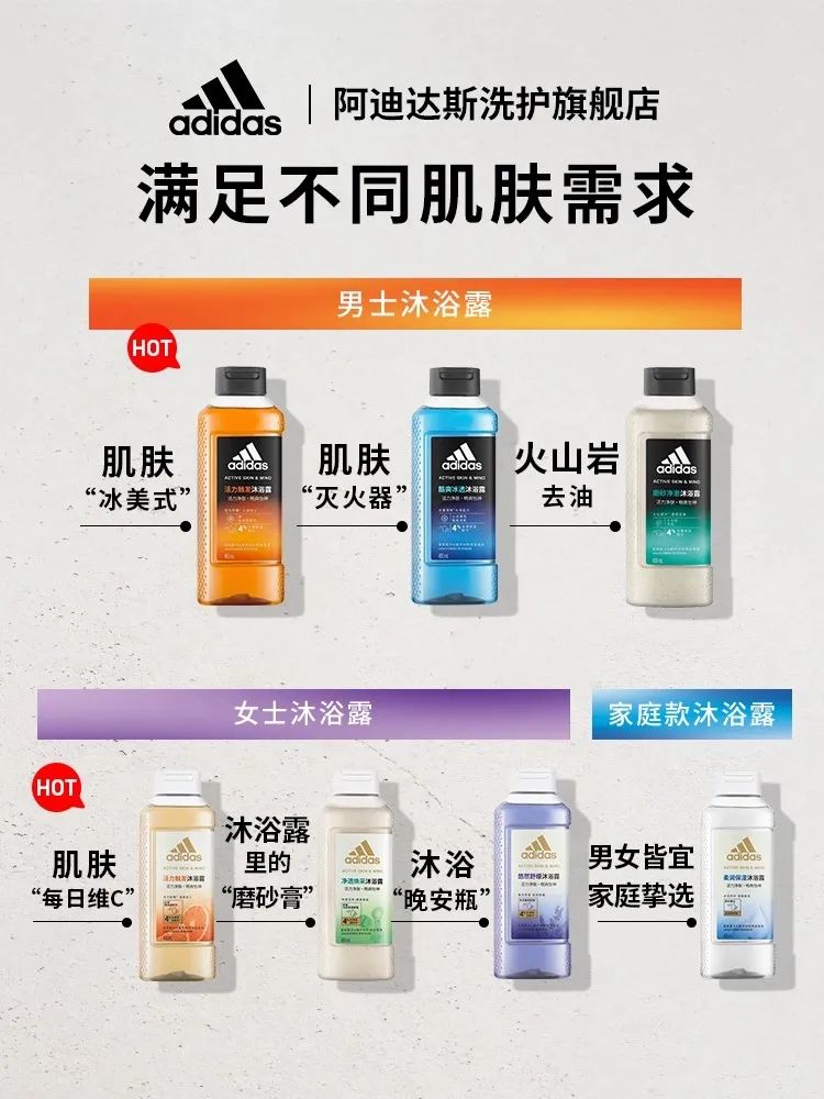 今年六月底,科蒂旗下的阿迪达斯个人护理品牌推出了全新的活力净肤系列沐浴露。据了解,与以往的男士“三合一”沐浴露不同,该系列共有七款沐浴露,专为满足不同人群肌肤需求而设计,包括三款男士沐浴露、三款女士沐浴露和一款家庭款沐浴露。同时,阿迪达斯还根据不同的运动场景需求,将沐浴露细分了清洁、舒缓、补水等多种功效。
