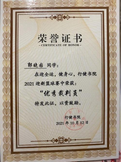 经过不懈的努力,郭晓园最终成功考取了篮球三级裁判证。三级裁判资格,需要对记录台的工作很娴熟,最开始他一直在做记录台,例如对场上的暂停、换人,篮球比赛记录表的规范记录等内容。也正是因为经历了这么多的记录台工作,使他学习到了很多优秀裁判员在临场比赛中对于比赛场上的判罚,对于比赛的节奏掌控这方面的知识。