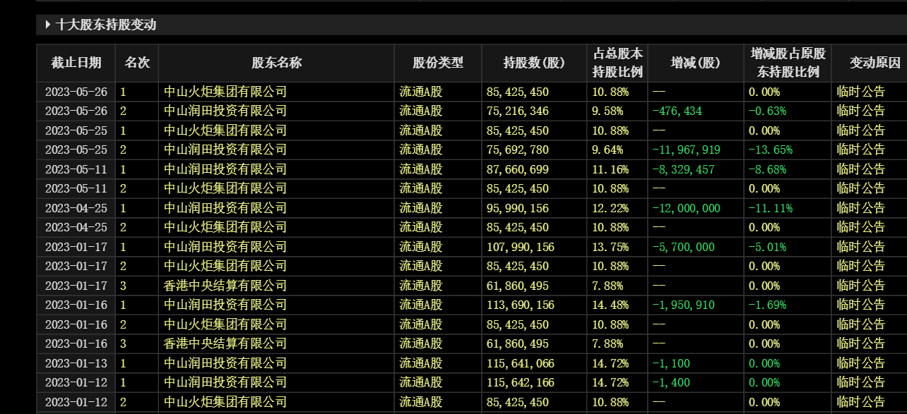 从交易所发布的公开信息可以清晰看出,进入2023年后,宝能系的中山润田投资有限公司不断减持,持股从此前的14.73%,逐步下滑到5月末的9.58% 。而原来的第二大股东中山火炬集团,则一股不变,就地躺赢,以10.88%的持股,上升为单一第一大股东。