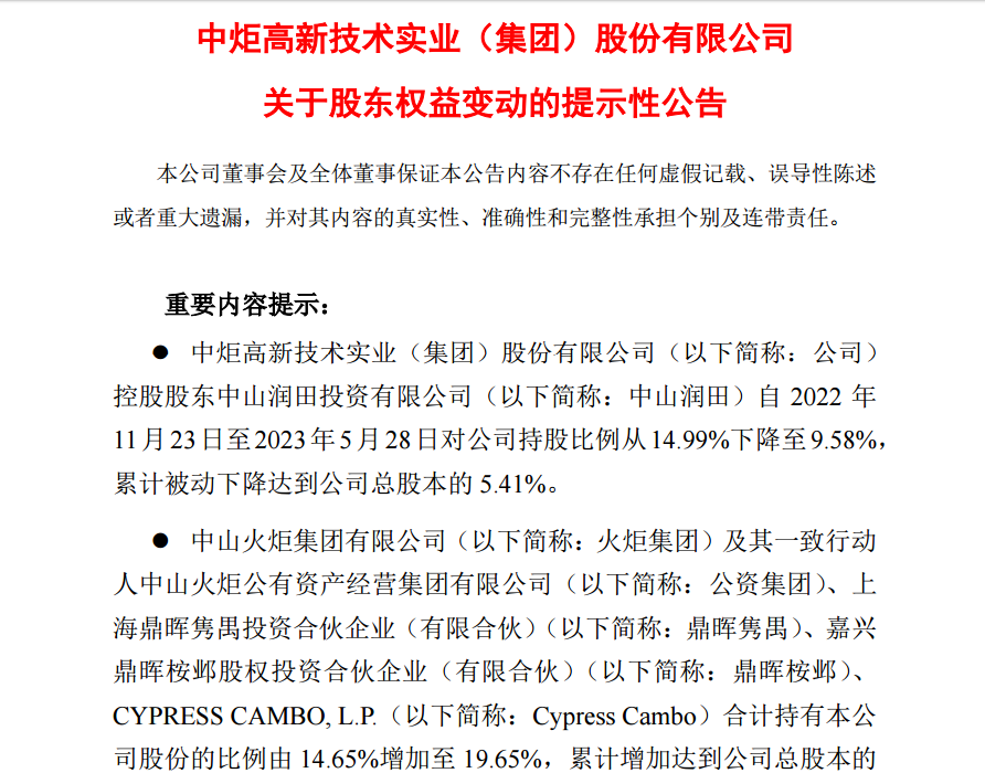 5月30日,中炬高新发布公告称,公司持股5%以上股东火炬集团的一致行动人公资集团、鼎晖隽禺、鼎晖桉邺、CYPRESS CAMBO, L.P.在近期分别增持了公司股份,增持股份达1%。本次权益变动后,上述相关方及其一致行动人火炬集团合计持有中炬高新的股份比例由18.02%增加至19.59%。