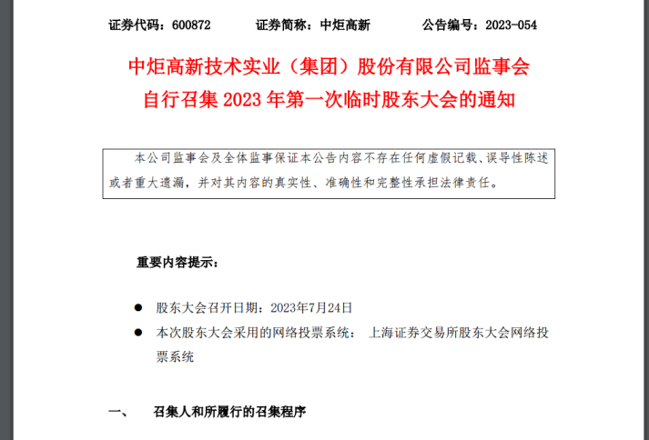 7月7日,由中炬高新监事会发起,定于7月24日召开公司临时股东大会。
