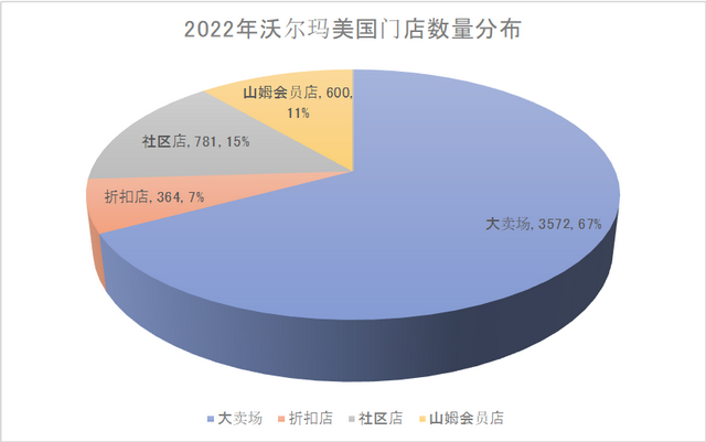 门店数量方面,以2022年数据为例,大卖场以3572家占整体门店数量的67%,社区店以781家店占整体数量的15%,山姆会员店600家占整体数量的11%,最后的折扣店为364家。
