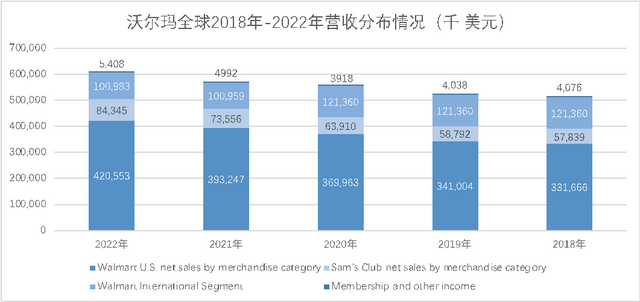 现阶段,沃尔玛美国、沃尔玛国际、山姆会员店及会员费构成了沃尔玛的主要营收来源。