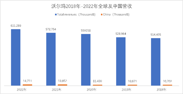 笔者梳理沃尔玛近五年(2018年-2022年)的全球年报数据发现,其全球营收由5144亿美元增长至6113亿美元,复合增长率为4.41%,且始终在全球零售企业中排名第一。