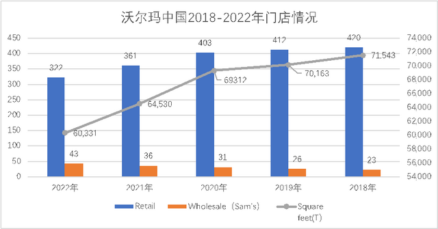 沃尔玛大卖场的门店数量变化更为显著,从2018年的420家锐减到2022年的322家,五年时间在中国内地共关闭近100家店。