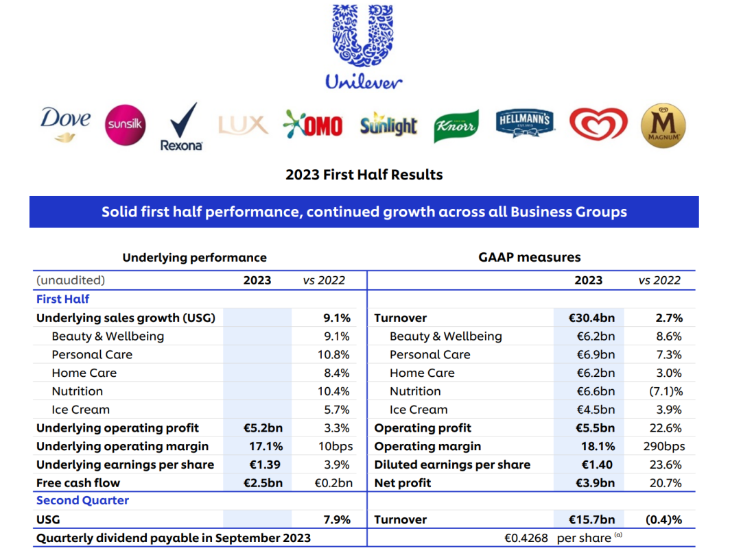 小食代翻阅的财报显示,2023年上半年,联合利华的营业额为304亿欧元,同比增长2.7%;基本营业利润达到52亿欧元,同比增长3.3%;基本销售额增长9.1%,其中价格增长9.4%,销量略微下滑0.2%。