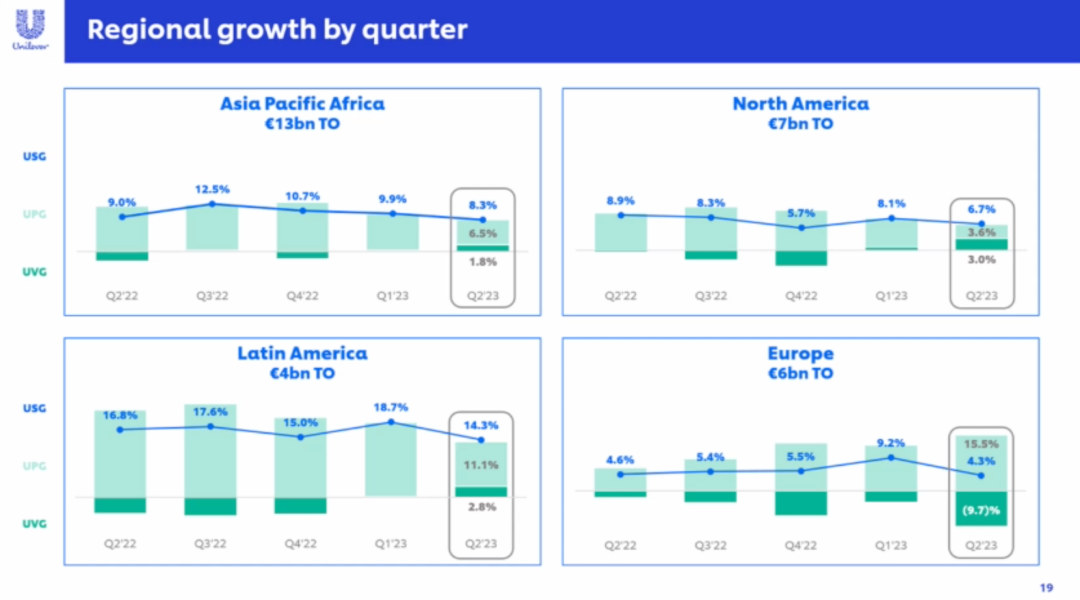 财报显示,2023年上半年,包括中国在内的亚太和非洲区(Asia Pacific Africa)的基本销售额增长为9.1%,其中价格增长8%,销量增长1.1%。该大区占集团营业额的44%。