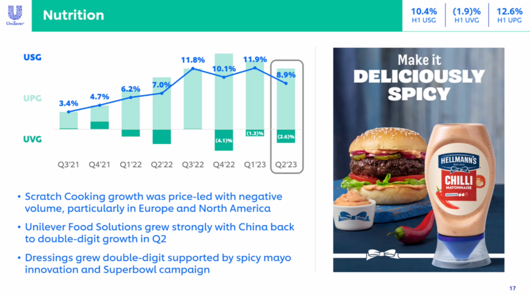 上半年,这一事业群的营收达66亿欧元,同比下降9.3%,约占联合利华总营收的22%,规模仅次于个人护理事业群排名第二。基本销售额增长10.4%,其中价格增长12.6%,销量下滑1.9%。