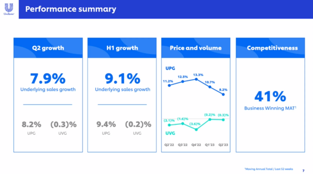 路透指出,联合利华上半年的销售增长好于预期,这导致其股价开盘后上涨了5%。路透又引述联合利华CFO Graeme Pitkethly在与记者的电话会议上表示,公司已过了通胀高峰,但是在财务数据中,定价依然贡献了很多的业绩增长。他说,公司会将业务重点转向拉动销量的增长。