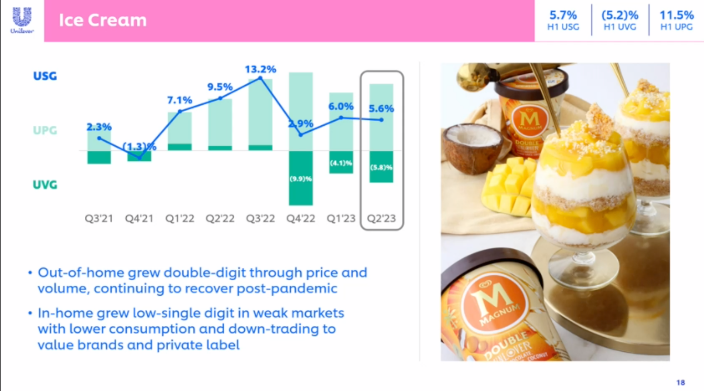 “(上半年)居家冰淇淋实现低个位数增长,但销量持续出现下降,因为在通胀环境下,该品类的非必需品属性导致了更低的消费量。而户外冰淇淋则实现双位数增长,价格和销量均有所上涨。”联合利华表示。