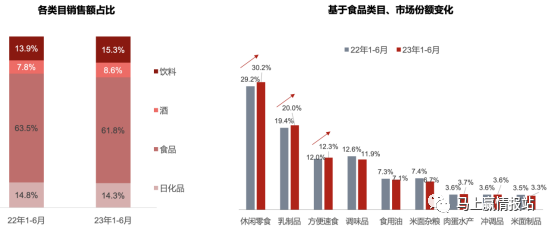 各类目销售额占比及食品类目内品类市场份额变化;来源:马上赢研究院
