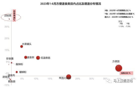 受过去几年疫情影响,方便速食在过去几年中长期占据食品类消费市场的最大份额。方便面、常温火腿肠等品类虽销售额占比较高,但品牌集中度偏高、品类增速甚至为负。马上赢研究院在此次报告中将关注放在了预制菜赛道,提出销售额占比小但品类增速高达42%的预制菜正在成为投资热点。